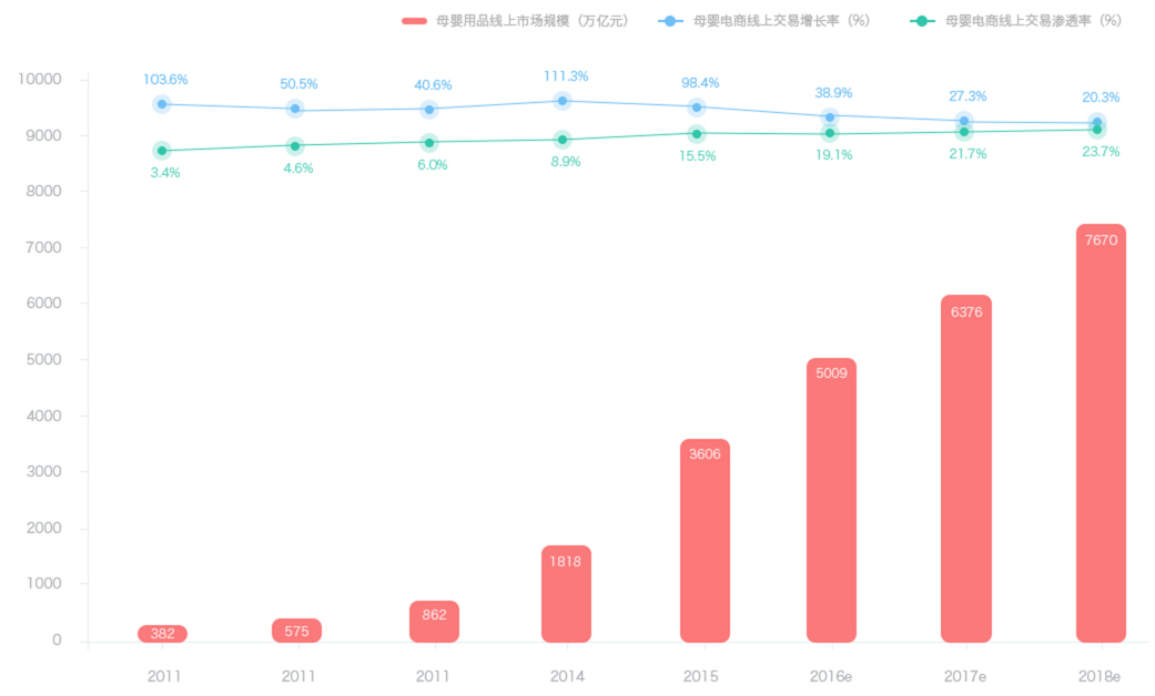 隨著中國全面二孩的開放,以及跨境網(wǎng)購市場的發(fā)展,母嬰網(wǎng)購市場發(fā)展空間巨大。預計到2018年母嬰市場交易規(guī)模將超3萬億元,其中線上交易規(guī)模預計達到7670億元,滲透率達24%。根據(jù)市場規(guī)律,2016年~2018年將是母嬰電商紅利期!切勿錯失良機!