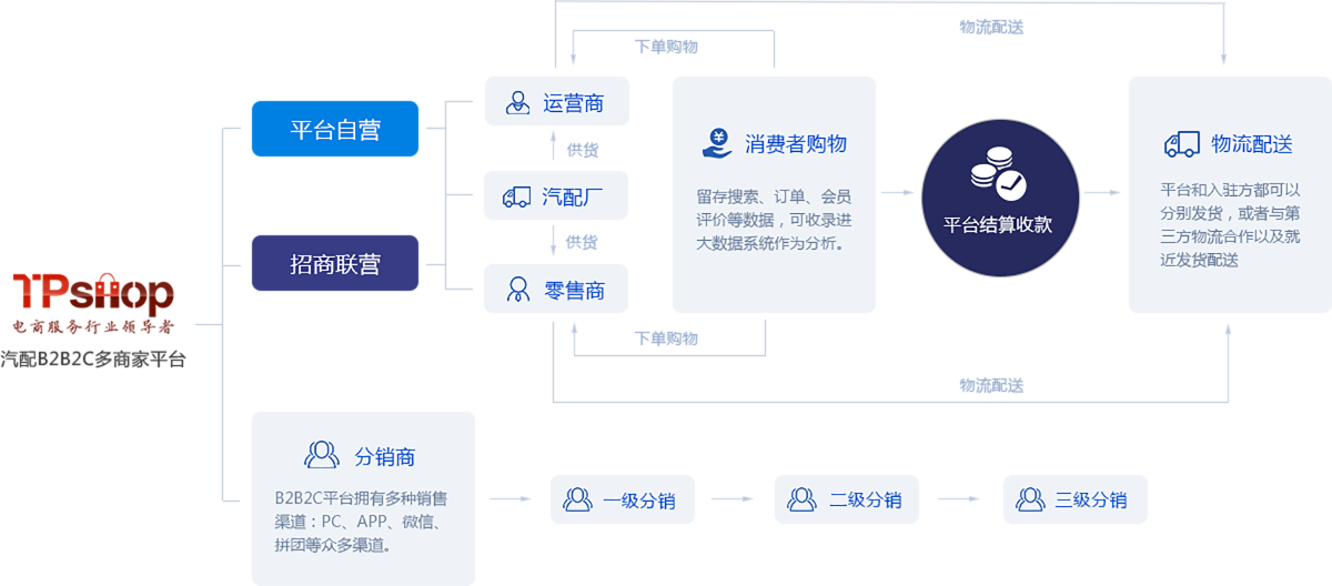 TPshop針對當下汽配電商行業(yè)的痛點和傳統(tǒng)4S店銷售模式的優(yōu)勢,以“B2B2C+O2O”的理念